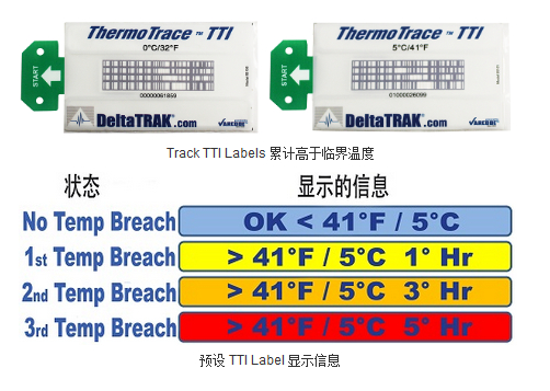DeltaTrak 的冷藏鏈解決方案包括 ThermoTrace TTI 標(biāo)簽和 ThermoTrace TTI 服務(wù)。TTI 標(biāo)簽是一個(gè)低成本的一次性的條碼標(biāo)簽,支持各種預(yù)定的時(shí)間和溫度;隍(yàn)證的 (無毒) 化學(xué)過程,條碼會(huì)由跟蹤三個(gè)不同水平的溫度變化累積而改變。這個(gè)動(dòng)態(tài)過程在每次條碼掃描時(shí)被實(shí)時(shí)地記錄。