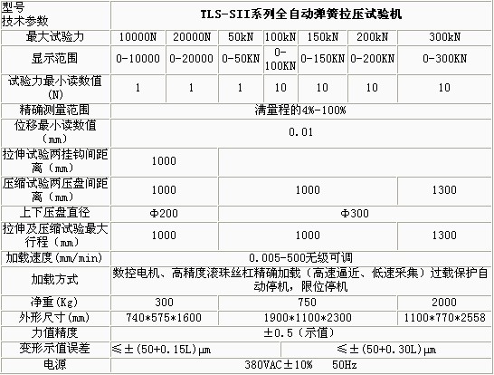 產(chǎn)品概述: TLS-SII系列全自動數(shù)顯式拉壓試驗(yàn)機(jī)是適用于拉壓試驗(yàn)的新型試驗(yàn)設(shè)備。試驗(yàn)機(jī)主機(jī)的設(shè)計(jì)具有外形美觀、操作方便、性能穩(wěn)定可靠的特點(diǎn)。試驗(yàn)機(jī) 采用數(shù)控電機(jī)及先進(jìn)的單片機(jī)控制技術(shù)加載及控制,能實(shí)現(xiàn)雙速預(yù)置。實(shí)現(xiàn)了高速逼近,低速采集。提高了測試精度,彈簧 試驗(yàn)機(jī),保證了試驗(yàn)效率。 功能特點(diǎn): 自動變速檢測5個測試點(diǎn),并自動返回到試驗(yàn)初始位置 LED顯示,煙臺彈簧試驗(yàn)機(jī)價格,人機(jī)對話直觀明了便于操作 可以選擇多種測試方法,順次自動完成一批工件的測試,可查看已測數(shù)據(jù) 傳感器引起的變形量可以補(bǔ)償,既傳感器和整機(jī)剛度引起的變形不影響位移精度。 可實(shí)現(xiàn)試驗(yàn)力、試驗(yàn)速度、位移等多種控制方式,具有以下功能: 設(shè)定變形量F,檢測彈簧的試驗(yàn)力P; 設(shè)定彈簧的剩余高度H,檢測彈簧的試驗(yàn)力P; 彈簧變形的檢測已工作壓盤接觸彈簧為準(zhǔn),彈簧 疲勞試驗(yàn)機(jī),此時試驗(yàn)力有反應(yīng),試驗(yàn)力(初始力)的大小任意設(shè)定。 技術(shù)參數(shù):
