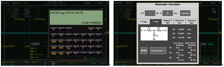 GDS-300/GDS-200系列示波器內(nèi)建多樣化的應(yīng)用軟件以提供使用者極為貼心的輔助工具。在繁瑣的電路設(shè)計當(dāng)中,虛擬示波器 ,工程計算機(jī)軟件可提供簡易到進(jìn)階的數(shù)學(xué)計算功能,讓工程師能夠徹底地了解電路的響應(yīng)以及參數(shù)表現(xiàn)值。衰減器計算軟件不僅提供衰減值計算的功能,亦提供在不同的衰減模型下,該具備的各項元件參數(shù)數(shù)值。電阻值計算軟件,可以根據(jù)不同的表面鑲嵌式電阻代碼提供正確的阻值外,亦提供色碼電阻阻值的查詢功能,對于初學(xué)的學(xué)生到資深的電子工程師皆是一向強(qiáng)大的輔助利器。