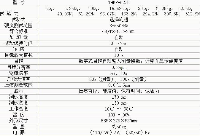 產(chǎn)品概述: THBP-62.5數(shù)顯小負(fù)荷布氏硬度計(jì)是光機(jī)電一體化的高新技術(shù)產(chǎn)品,南京布氏硬度計(jì)代理商,它造型新穎、美觀,自動(dòng)布氏硬度計(jì),具有良好的直觀性、可操作性和可靠性,便攜布氏硬度計(jì),是測(cè)試小負(fù)荷布氏硬度的理想產(chǎn)品。 功能特點(diǎn): 1 、 儀器具備7級(jí)試驗(yàn)力,布氏硬度儀,8種測(cè)試的布氏標(biāo)尺任意選擇; 2、具備了5x 和10x 兩組物鏡,且都能參與測(cè)量; 3、物鏡和壓頭間智能式自動(dòng)切換; 4、預(yù)置試驗(yàn)力保持時(shí)間、調(diào)節(jié)測(cè)量光源的強(qiáng)弱功能; 5、自動(dòng)顯示測(cè)量壓痕長(zhǎng)度、硬度值、測(cè)量次數(shù)等;帶熱敏打印機(jī)。 6、硬度測(cè)試結(jié)果打印輸出,硬度計(jì)廠家,RS232超級(jí)終端設(shè)置,供用戶擴(kuò)展功能。 7、硬度計(jì)還可根據(jù)用戶特殊需求配置CCD裝置、視屏測(cè)量裝置和攝像裝置。 8、本儀器采用精密的結(jié)構(gòu)設(shè)計(jì),試驗(yàn)力施加由力值傳感器控制,錘擊式布氏硬度計(jì)對(duì)照表,使整機(jī)結(jié)構(gòu)緊湊,河北硬度計(jì),加卸試驗(yàn)力時(shí)平穩(wěn)、準(zhǔn)確。在電氣上由CPU控制試驗(yàn)過(guò)程,金屬布氏硬度計(jì)檢定規(guī)程,物鏡和壓頭采用智能式自動(dòng)切換,布氏硬度,切換定位采用機(jī)械與電子雙重配合,使定位精度更高。 9、本儀器適用于測(cè)量鑄鐵、有色金屬及合金材料,布氏硬度計(jì)參數(shù),各種退火、調(diào)質(zhì)處理后的鋼材。特別是較軟的金屬如:鋁、鉛、錫等材料測(cè)試的硬度值更正確。 技術(shù)參數(shù):