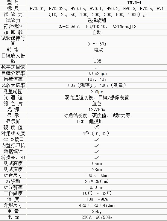 • TMVM-1觸摸屏顯微維氏硬度計硬度計儀器在機械上采用精密的設(shè)計,維氏硬度計說明書,在電氣上由CPU控制試驗過程,求購維氏硬度計,在光學(xué)上采用高清晰光學(xué)測量系統(tǒng)、光電傳感等新技術(shù)。 • 適用于測量微小、薄形試件、表面滲鍍處理后的零件和對瑪瑙、玻璃、陶瓷等脆性材料的顯微和努氏硬度的測定 以及涂層、表面覆層、層壓金屬、熱處理碳化層和淬火硬化層的深度與硬度梯度的測定。是科研機構(gòu)、工廠及質(zhì)檢部門進行研究和檢測的理想的硬度測試儀器。 功能特點: • 操作由面板上的觸摸鍵輸入,維氏硬度計使用,能預(yù)置試驗力保荷時間、選擇維氏或努氏試驗方法、調(diào)節(jié)測量光源的強弱等功能。 • 在LCD液屏上顯示測量壓痕長度、硬度值、測量次數(shù)、轉(zhuǎn)換值等,硬度計,并通過打印機輸出,維氏硬度計載荷選擇,還能通過RS232接口與計算機連網(wǎng)。 • 硬度計還可根據(jù)用戶特殊需求配置CCD裝置、視屏裝置和攝像裝置 技術(shù)參數(shù):