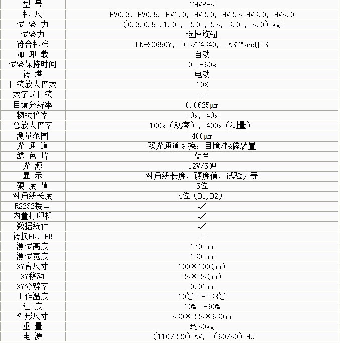 • THVP-5大屏數(shù)顯手動(dòng)轉(zhuǎn)塔維氏硬度計(jì)是光機(jī)電一體化的高新技術(shù)產(chǎn)品,顯示屏使用大的LCD屏幕,維氏硬度計(jì)讀數(shù),它造型新穎、美觀,具有良好的直觀性、可操作性和可靠性,深圳尚材維氏硬度計(jì),是測(cè)試維氏硬度的理想產(chǎn)品。該機(jī)的壓頭和物鏡之間的轉(zhuǎn)換采用自動(dòng)切換裝置. • 適用于測(cè)量微小、薄形試件、表面滲鍍處理后的零件和對(duì)瑪瑙、玻璃、陶瓷等脆性材料的顯微和努氏硬度的測(cè)定 以及涂層、表面覆層、層壓金屬、熱處理碳化層和淬火硬化層的深度與硬度梯度的測(cè)定。是科研機(jī)構(gòu)、工廠及質(zhì)檢部門進(jìn)行研究和檢測(cè)的理想的硬度測(cè)試儀器。 功能特點(diǎn): • 硬度計(jì)在機(jī)械上采用精密的結(jié)構(gòu)設(shè)計(jì),在光學(xué)上采用高倍率物鏡和數(shù)顯式測(cè)微目鏡,維氏硬度計(jì)日常點(diǎn)檢表,測(cè)量光源采用冷光源等先進(jìn)技術(shù)。 • 采用閉環(huán)式加載控制系統(tǒng),全自動(dòng)維氏硬度計(jì),使試驗(yàn)力精度提高,維氏硬度計(jì)檢定規(guī)程,示值的重復(fù)性及穩(wěn)定性佳。該系統(tǒng)用在維氏硬度計(jì)上,維氏硬度計(jì) 北京時(shí)代,在國(guó)內(nèi)屬首創(chuàng)。 • 操作由面板上的觸摸鍵輸入,維氏硬度計(jì)誤差,能預(yù)置試驗(yàn)力保荷時(shí)間、調(diào)節(jié)測(cè)量光源的強(qiáng)弱、選擇維氏或努氏測(cè)試模式、硬度轉(zhuǎn)換標(biāo)尺、文件號(hào)與儲(chǔ)存等。并能在屏幕上 顯示測(cè)量壓痕長(zhǎng)度、硬度值、測(cè)量次數(shù)和年、月、日及時(shí)間等,維氏硬度計(jì)說明書,試驗(yàn)結(jié)果和數(shù)據(jù)處理,維氏硬度計(jì)算,并通過打印機(jī)輸出,維氏硬度計(jì)標(biāo)準(zhǔn),還能通過RS232接口與計(jì)算機(jī)連接。 • 本硬度計(jì)還可根據(jù)用戶特殊需求配置CCD裝置進(jìn)行視頻測(cè)量和自動(dòng)測(cè)量。 技術(shù)參數(shù):