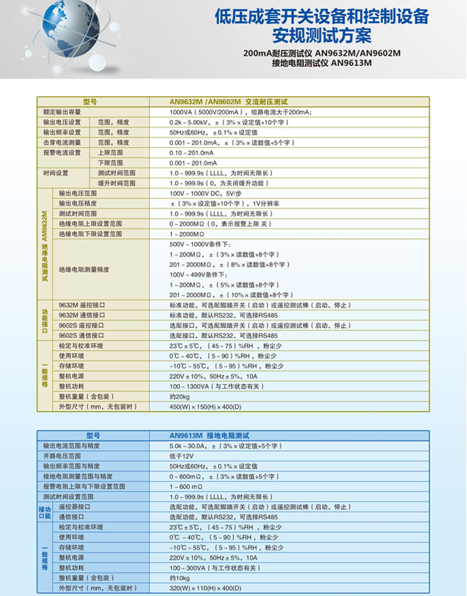 產(chǎn)品概述: 艾諾AN9602M耐壓測(cè)試儀具備交流耐壓輸出5000VAC/200mA(持續(xù)時(shí)間30分鐘),絕緣電阻測(cè)量范圍1~2000MΩ,并能快速準(zhǔn)確的完成上述性能指標(biāo)的測(cè)試,精密程控絕緣耐壓測(cè)試儀,能滿足各電器、元器件生產(chǎn)廠家和質(zhì)檢部門依照國(guó)際和國(guó)家安規(guī)標(biāo)準(zhǔn)進(jìn)行上述安全性能檢測(cè)的要求。 AN9632M絕緣耐壓測(cè)試儀具備交流耐壓輸出5000VAC/200mA(持續(xù)時(shí)間30分鐘),絕緣電阻測(cè)量范圍1~2000MΩ,臺(tái)灣絕緣耐壓測(cè)試儀,并能快速準(zhǔn)確的完成上述性能指標(biāo)的測(cè)試,能滿足各電器、元器件生產(chǎn)廠家和質(zhì)檢部門依照國(guó)際和國(guó)家安規(guī)標(biāo)準(zhǔn)進(jìn)行上述安全性能檢測(cè)的要求。