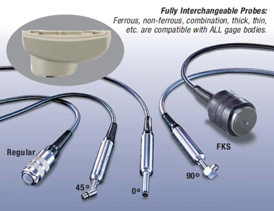 從各種測(cè)量范圍和探頭樣式選擇的PosiTector 6000量具的身體和一個(gè)探頭。提供多種選擇的互換探頭。